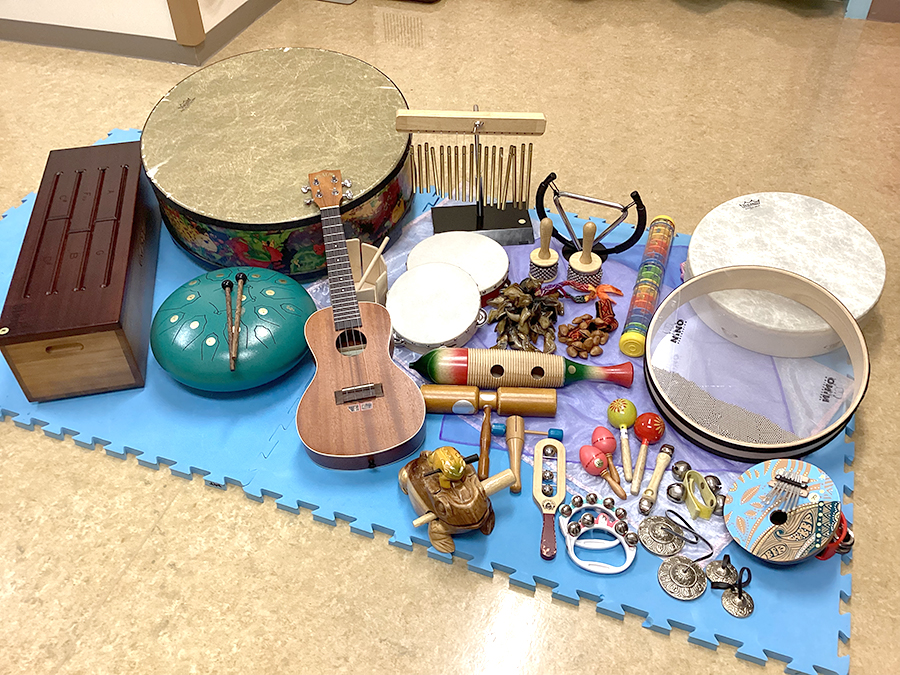 楽器の音色や歌・リズム等に対する反応や好みを観察し、個人・場面に応じた音や音楽を使いながら、お子さんの動きや発声・笑顔を引き出し、様々なコミュニケーションを促しています。